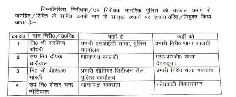 जारी आदेश के अनुसार निरीक्षक अरविन्द चौधरी को प्रभारी एसआईटी शाखा, पुलिस कार्यालय से स्थानांतरित कर प्रभारी निरीक्षक थाना कालसी नियुक्त किया गया है। वहीं उप निरीक्षक दीपक घारिवाल को थाना कालसी से हटाकर एसओजी शाखा देहरादून भेजा गया है। इसी क्रम में निरीक्षक बीएनएल भारती को प्रभारी सीनियर सिटीजन सेल, पुलिस कार्यालय से स्थानांतरित कर प्रभारी निरीक्षक थाना चकराता बनाया गया है। जबकि उप निरीक्षक शेखर चन्द्र नौटियाल को थाना चकराता से स्थानांतरित कर कोतवाली विकासनगर में तैनाती दी गई है।